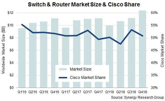 ICCSZ訊(編譯:Vicki)Synergy Research Group的最新數(shù)據(jù)顯示,以太網(wǎng)交換機和路由器市場的供應(yīng)商收入在2018年第四季度超過了120億美元大關(guān),創(chuàng)下歷史新高。全年供應(yīng)商收入超過440億美元,比2017年增長4%。以太網(wǎng)交換機,企業(yè)路由器和服務(wù)提供商路由器在第四季度均比2017年同期增長了兩位數(shù)。全年路由器市場相對平穩(wěn),以太網(wǎng)交換機的支出增長了8%。思科在交換機和路由器市場的份額在第四季度為51%,思科在過去十二個季度中市場份額已經(jīng)超過50%。在三個主要市場中,思科第四季度以太網(wǎng)交換機的份額為57%,企業(yè)路由器為60%和服務(wù)提供商路由器為37%。在思科之后,三個市場中的供應(yīng)商排名都不同,但總體而言,緊隨思科其后的是華為,諾基亞,Juniper網(wǎng)絡(luò),Arista Networks和HPE。其他活躍的供應(yīng)商包括愛立信,Extreme,H3C和中興通訊。