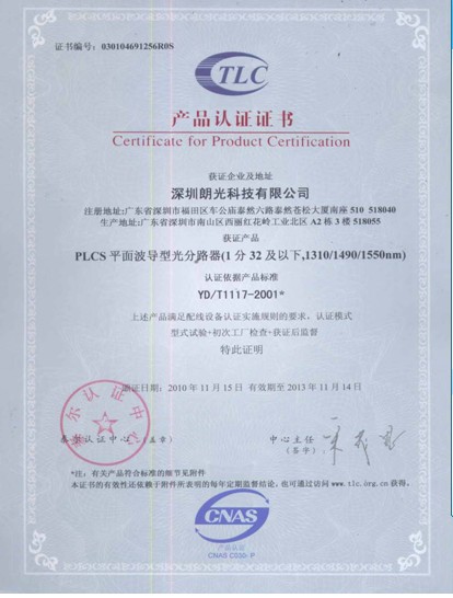 【訊石光通訊咨詢網(wǎng)】朗光科技有限公司-深圳,2010年11月,經(jīng)過(guò)泰爾認(rèn)證中心人員的現(xiàn)場(chǎng)審核,以及相關(guān)型號(hào)產(chǎn)品的可靠性試驗(yàn),朗光科技近日獲得了泰爾認(rèn)證中心頒發(fā)的PLC 分路器認(rèn)證證書(shū)。至此,朗光科技的PLC 分路器產(chǎn)品可以配合我們的客戶,更好的服務(wù)于中國(guó)的三大運(yùn)營(yíng)商。