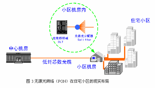 圖3是無源光網(wǎng)絡(luò)(PON)在住宅小區(qū)的現(xiàn)實布局:OLT和Splitter均放置在小區(qū)機(jī)房里。這種現(xiàn)實布局優(yōu)點(diǎn)是:中心機(jī)房至住宅小區(qū)只需要低芯數(shù)光纜,現(xiàn)有光纜資源就能滿足需要;整個住宅小區(qū)接入線路均在小區(qū)機(jī)房配線,容許用戶自由選擇不同電信運(yùn)營商,對電信運(yùn)營商而言網(wǎng)絡(luò)非常容易放號、維護(hù)和管理;由于接入設(shè)備和配線架同在小區(qū)機(jī)房,無疑顯著提高設(shè)備端口利用率,接入設(shè)備可以根據(jù)接入用戶數(shù)增加而逐步擴(kuò)容。但這種現(xiàn)實的布局也有其明顯的缺點(diǎn):首先,丟棄PON的網(wǎng)絡(luò)結(jié)構(gòu)是無源網(wǎng)絡(luò)的最大優(yōu)勢,中心機(jī)房至用戶網(wǎng)絡(luò)還是有源網(wǎng)絡(luò);其次,并沒有因為PON而節(jié)約光纜資源;再者,PON設(shè)備成本高、網(wǎng)絡(luò)結(jié)構(gòu)復(fù)雜。