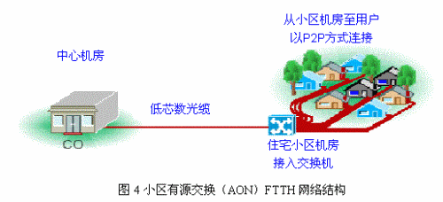 圖4是典型基于AON的FTTH網(wǎng)絡(luò)結(jié)構(gòu),從電信運(yùn)營商中心機(jī)房至小區(qū)機(jī)房沿用目前已有的低芯數(shù)光纜,在小區(qū)機(jī)房放置交換系統(tǒng),從小區(qū)機(jī)房至用戶端采用點(diǎn)對點(diǎn)(P2P)組網(wǎng)方式,接入設(shè)備和配線架統(tǒng)一放置小區(qū)機(jī)房,整個網(wǎng)絡(luò)采用技術(shù)成熟、成本低廉的以太網(wǎng)協(xié)議。AON的點(diǎn)對點(diǎn)FTTH網(wǎng)絡(luò)是目前在日本和美國普遍采用的FTTH接入技術(shù),在目前全球500萬線的FTTH用戶中,95%以上采用有源交換的P2P技術(shù)。其突出優(yōu)勢有: