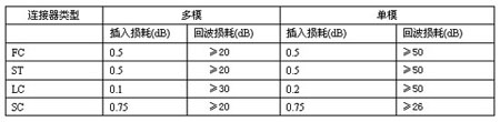 在本文中,我們所說的插入損耗是指由于連接器接口產(chǎn)生的分貝丟失,回波損耗與銅線中的概念一樣,是指由終端反射引起的將能量反射回信號源的情況。連接器插入損耗和回波損耗參數(shù)的界定由系統(tǒng)所使用的測試設備決定。盡管各個廠家生產(chǎn)的連接器規(guī)格各有不同,但大多數(shù)都符合TIA/EIA568B.3商用數(shù)據(jù)網(wǎng)絡要求。TIA/EIA568B.3規(guī)定,多模和單模光纖的最大插入損耗為0.75dB。多模光纖的回波損耗最小≥20dB,單模光纖的回波損耗≥26dBD。SC連接器通常都只有0.3dB的損耗,而LC連接器則可低達0.1dB。