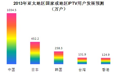 到2013年,亞洲IPTV的家庭擁有水平將進一步提高。中國將成為全球第一,家庭用戶達到1034.5萬,日本為452.2萬,排世界第四;韓國258.3萬,列第六位;臺灣131.9,列世界第十位;香港124.9萬,列世界十二位。
