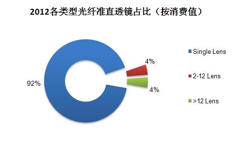 根據(jù)ElectroniCast的估算,2012年,在整體光纖準直透鏡消費值中,單個透鏡占比最高達到92%,2-12透鏡陣列占4%,超過12枚透鏡的陣列占4%。