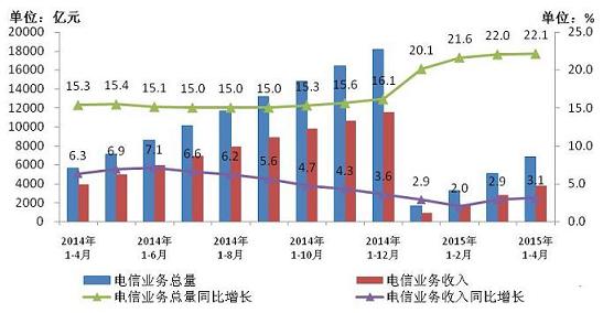 2015年1-4月,電信業(yè)務總量完成6887.5億元,同比增長22.1%,繼續(xù)保持加速增長趨勢。電信業(yè)務收入完成3746.2億元,按可比口徑測算同比增長3.1%,比1-3月提高0.2個百分點,繼續(xù)顯現(xiàn)回升態(tài)勢。