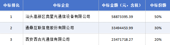 ICC訊 日前,中國鐵塔2025-2026年光纜集采結(jié)果出爐,三家企業(yè)中標。汕頭高新區(qū)奧星光通信設備有限公司以5887萬元(含稅)報價位列第一中標人,通鼎互聯(lián)信息股份有限公司和西安西古光通信有限公司分別以3349萬元和2347萬元含稅報價位列第二、第三中標人。
