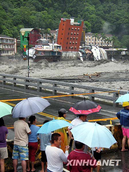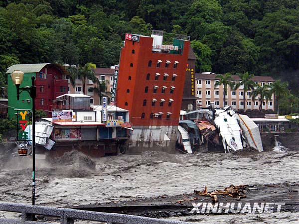 8月9日,在臺東知本溫泉區(qū),6層樓高的金帥飯店被洪水沖倒。