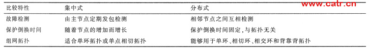 以太網(wǎng)環(huán)形組網(wǎng)技術(shù)主要是指數(shù)據(jù)設(shè)備通過物理鏈路相互連通成環(huán)形,新的信令控制協(xié)議通過標準以太網(wǎng)幀的方式在環(huán)內(nèi)交互,因為在環(huán)內(nèi)采用了專門的封裝或接口,因此對外表現(xiàn)為以太網(wǎng)接口。以太網(wǎng)環(huán)形組網(wǎng)技術(shù)主要包括烽火網(wǎng)絡(luò)的MSR/ESR、諾基亞西門子的ERP、中興的ZESR等,其在控制方式上又分為集中式和分布式兩種,表1列出了這兩種控制方式的一些不同。