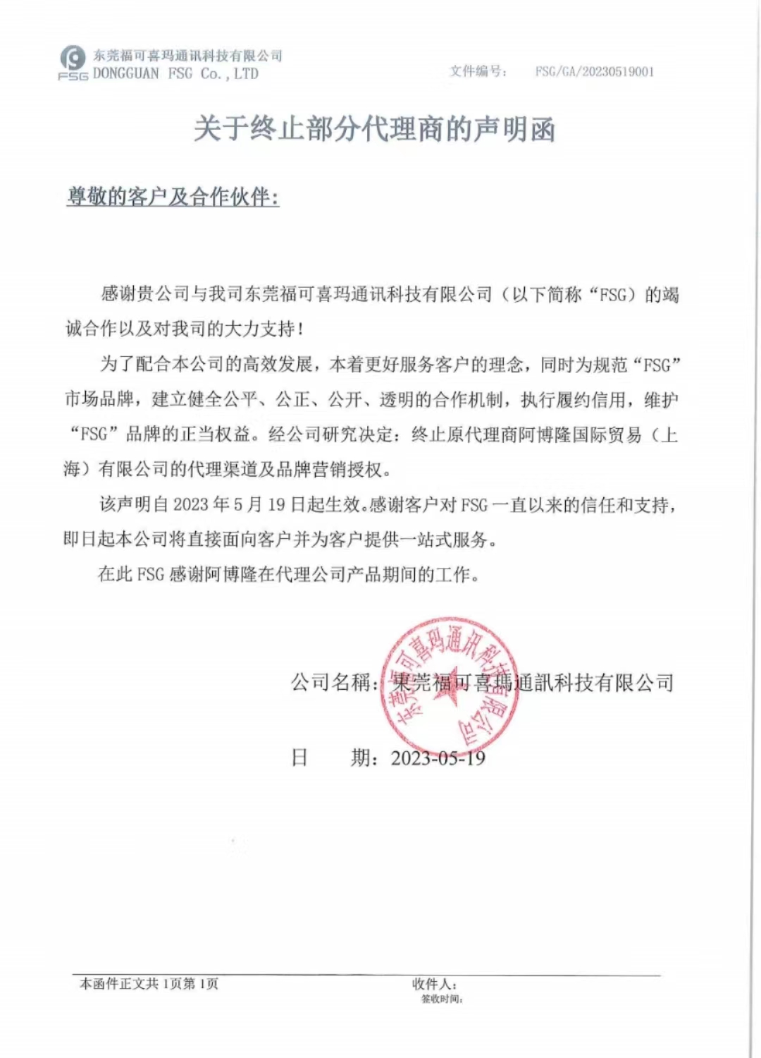 ICC訊 東莞??上铂斖ㄓ嵖萍加邢薰緸檫M(jìn)一步加強(qiáng)“FSG(福島)”品牌建設(shè),持續(xù)為廣大客戶(hù)提供更優(yōu)質(zhì)的服務(wù),經(jīng)公司管理層決議,于2023年5月19日起,停止并解除部分品牌代理業(yè)務(wù)委托,具體內(nèi)容如下: