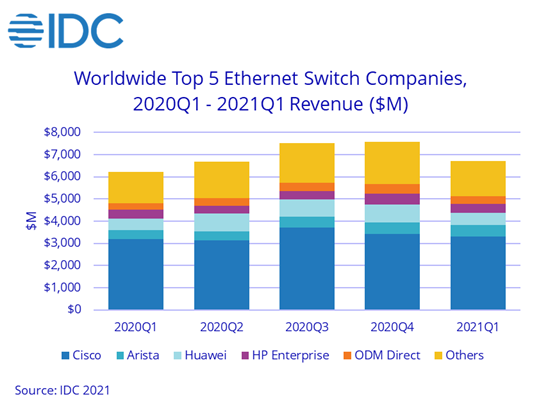 ICC訊(編譯:Nina)根據(jù)IDC近日發(fā)布的報(bào)告,2021年第一季度,全球以太網(wǎng)交換機(jī)市場(chǎng)收入達(dá)到67億美元,同比增長(zhǎng)7.6%。同時(shí),全球企業(yè)和服務(wù)提供商(SP)路由器市場(chǎng)同比增長(zhǎng)14.4%至34億美元。