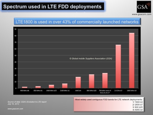 大多數(shù)運(yùn)營商部署FDD模式的LTE標(biāo)準(zhǔn)。最廣泛使用的頻帶仍然是1800 MHz(band 3),占已推出商業(yè)LTE FDD網(wǎng)絡(luò)的43%以上;下一個主流是2.6 GHz(band 7),占已推出LTE FDD網(wǎng)絡(luò)的34%;其次是800 MHz(band 20),占比為11%;緊隨其后的為AWS(band 4),占比約為9%。
