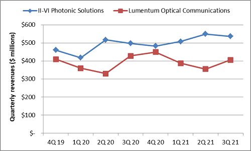 然而,II-VI還表示,供應鏈問題僅影響電信產(chǎn)品,并沒有延遲數(shù)據(jù)通信產(chǎn)品的發(fā)貨。Lumentum報告稱,公司工業(yè)和消費產(chǎn)品線以及商業(yè)激光器部門的收入抵消了半導體供應鏈短缺對其電信和數(shù)據(jù)通信產(chǎn)品線的影響。