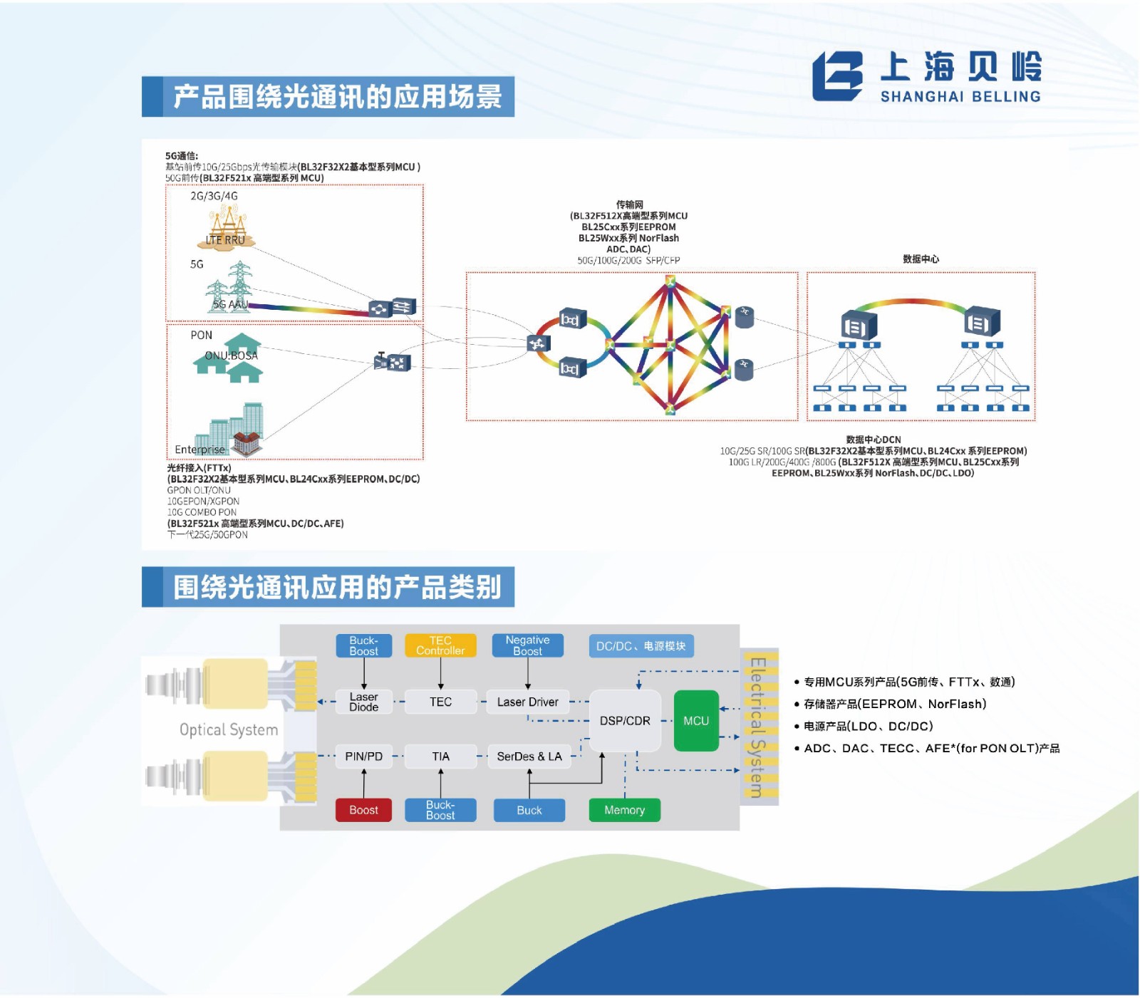 上海貝嶺面向光通訊-光模塊應(yīng)用市場布局系列產(chǎn)品,涵蓋光模塊專用SOC、存儲器(EEPROM、Norflash),電源產(chǎn)品、信號鏈產(chǎn)品等。