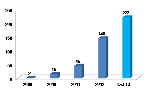 ICCSZ訊 2013年10月22號,據(jù)GSA關(guān)于LTE建設進展的最新報告,全球已經(jīng)有222家運營商確認在83個國家或地區(qū)推出了LTE商用服務。在過去的12個月中共有109個LTE商用網(wǎng)絡被推出。