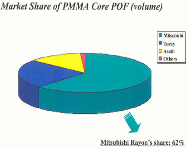 國內(nèi)塑料光纖產(chǎn)業(yè)面臨的另外一個挑戰(zhàn)是其規(guī)模,目前塑料光纖的全球市場被日本的三菱(Mitsubishi)、東麗(Toray)和旭硝子(Asahi)三家公司瓜分,在國內(nèi)FTTH市場上,他們也將會是國內(nèi)企業(yè)的強力競爭對手,國內(nèi)企業(yè)必須考慮我們的競爭優(yōu)勢在哪里。