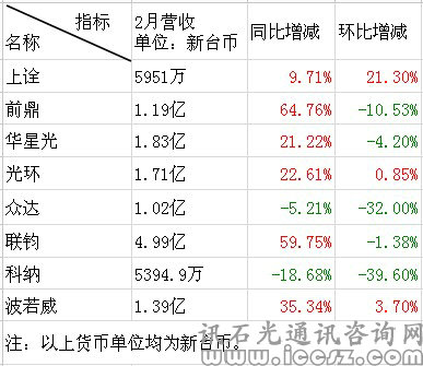 ICCSZ訊(編輯:Debi)陽春三月已至中旬,近日臺灣器件商紛紛披露2014年2月營收數(shù)據(jù),訊石小編綜合整理發(fā)現(xiàn)——逾七成器件商2月營收同比上漲,是否應(yīng)了不久前的“淡季不淡”之說?在此,訊石小編不敢斷言,畢竟,六成器件商2月營收環(huán)比1月有所下滑,余下環(huán)比上升的增幅也不大。挺過了年初的“招工難”問題,是否意味著臺灣器件商們可以安然度過今年余下的季節(jié)?下面來看訊石小編整理的數(shù)據(jù)。