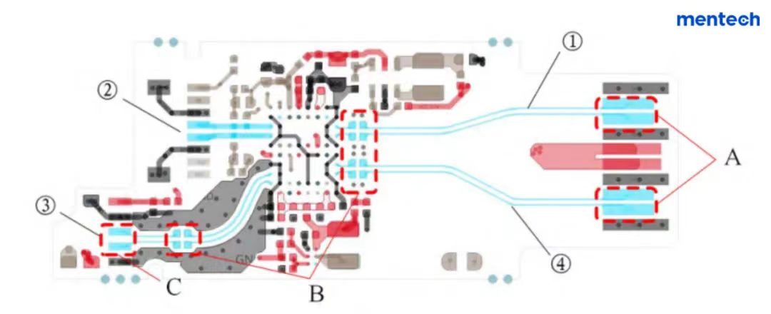 發(fā)射與接收軟板設(shè)計(jì):發(fā)射軟板采用微帶線結(jié)構(gòu)設(shè)計(jì),接收軟板則采用接地共面波導(dǎo)結(jié)構(gòu)設(shè)計(jì),并通過(guò)精細(xì)的打孔設(shè)計(jì)減少輻射損耗和抑制高次模分量,降低空間串?dāng)_,確保信號(hào)傳輸?shù)募儍襞c穩(wěn)定。