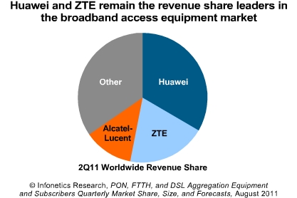 ※二季度,華為和中興繼續(xù)領頭整個寬帶接入設備市場,華為的收入份額占據(jù)全球總收入的1/3。