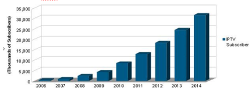 由政府推動(dòng)各家電信、廣播和互聯(lián)網(wǎng)運(yùn)營商加快覆蓋速度,中國網(wǎng)絡(luò)電視(IPTV)用戶將在未來幾年繼續(xù)快速增長。