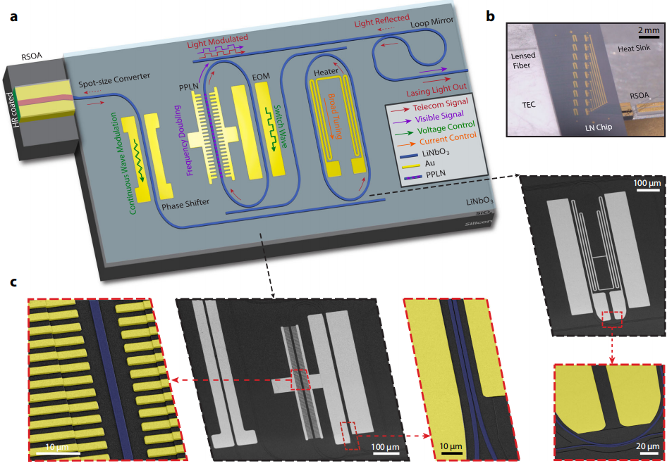 利用腔內(nèi)的二階諧波產(chǎn)生,該團隊進一步得到可見光的出射,首次在集成激光器實現(xiàn)通信與可見光的同時激射。“通過腔內(nèi) Pockels 電光效應(yīng),我們能夠?qū)崿F(xiàn)對產(chǎn)生的可見光與通信光同時高速調(diào)制,無論是調(diào)頻或是調(diào)幅。”李鳴驍說。