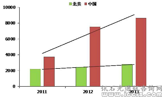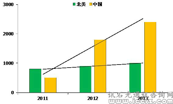 從圖一可以看出,在FTTH市場(chǎng)中國(guó)無(wú)論是在覆蓋數(shù)還是實(shí)際用戶都遠(yuǎn)超北美,從2011年到2013年FTTH覆蓋數(shù)中國(guó)分別是北美地區(qū)的168%、309%、415%;而實(shí)際用戶數(shù)從2011年至2013年中國(guó)分別是北美地區(qū)的63%、200%、240%。截至2013年9月北美地區(qū)的FTTH的覆蓋數(shù)占北美地區(qū)人口比例約為8.2%,而我國(guó)則為約為6.3%;FTTH實(shí)際用戶數(shù)占人口比例北美地區(qū)約為2.9%,而我國(guó)約為1.7%。從后面的這兩組數(shù)據(jù)可以看出我國(guó)在覆蓋率上和北美地區(qū)相差僅為2個(gè)百分點(diǎn),即我國(guó)只要把FTTH覆蓋數(shù)提高到1.1億戶即可,而以目前中國(guó)FTTH的發(fā)展速度來(lái)看2013年末就基本可實(shí)現(xiàn);要FTTH實(shí)際用戶數(shù)占人口比例達(dá)到北美水平,則只需要把實(shí)際用戶數(shù)提高到3924萬(wàn)戶,以現(xiàn)在的發(fā)展速度在2014年就可實(shí)現(xiàn)。
