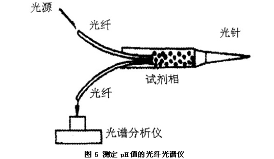 用來測定活體組織和血液值pH光纖光譜傳感器示意圖,如圖5所示。其工作原理是利用發(fā)射光、透射光的強度隨波長的分布光譜來進行測量。這種傳感器將兩根光纖插入可透過離子的纖維素膜盒中.膜盒內(nèi)裝有試劑,當把針頭插入組織或血管后,體液滲入試劑,導(dǎo)致試劑吸收某種波長的光.用光譜分析儀測出此種變化,即可求得血液或組織的pH值[13]。