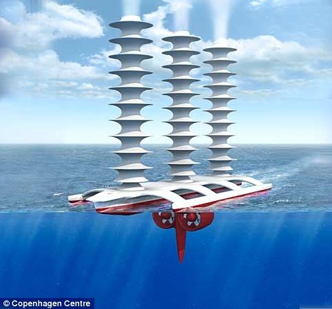 可以組成一支由風(fēng)力帶動(dòng)的船隊(duì),包括將近2000支船,在太平洋上擺成十字陣型,把抽上來的海水通過煙囪樣的高大的管道噴射到空中。