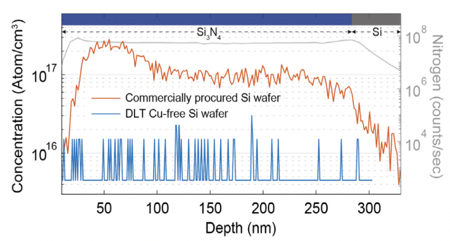 針對(duì)這一問(wèn)題,團(tuán)隊(duì)開發(fā)了兩種高效銅去除技術(shù):一是采用犧牲性氮化硅吸除層,在高溫退火中捕獲銅雜質(zhì)后剝離去除;二是集成氮化硅擴(kuò)散屏障,阻止銅雜質(zhì)向波導(dǎo)芯層擴(kuò)散。兩種方法均與商業(yè)代工廠工藝完全兼容,可直接融入標(biāo)準(zhǔn)生產(chǎn)流程。經(jīng)二次離子質(zhì)譜分析驗(yàn)證,處理后的氮化硅波導(dǎo)銅濃度低于檢測(cè)極限,傳輸損耗顯著降低,熱吸收效應(yīng)大幅減弱。