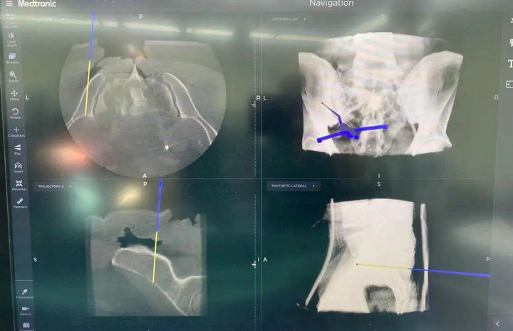 精準(zhǔn)切除腫瘤后,借助骨腫瘤科自主研發(fā)的3D打印組合式半側(cè)骶骨假體進(jìn)行重建。并在O臂導(dǎo)航系統(tǒng)的引導(dǎo)下,精確放置假體和螺釘,進(jìn)一步提升患者的重建效果。此外,該系統(tǒng)還可以縮短手術(shù)時(shí)間,加快患者的康復(fù)。