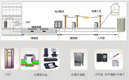 FTTx系統(tǒng)由局端機(jī)房設(shè)備﹙OLT﹚、用戶終端設(shè)備(ONT)、光配線網(wǎng)(ODN)三個部分組成。ODN作為FTTx系統(tǒng)的重要組成部分,是OLT和ONU之間的光傳輸物理通道,通常由光纖光纜、光連接器、光分路器以及安裝連接這些器件的配套設(shè)備組成。ODN包括五個部分:饋線段、光纜分配點、配線段、光纜接入點和入戶段。從局端機(jī)房的ODF架到光纜分配點的饋線段,作為主干光纜,實現(xiàn)長距離覆蓋;從光纜分配點到用戶接入點的配線段,對饋線光纜的沿途用戶區(qū)域進(jìn)行光纖的就近分配;用戶接入點到終端的入戶段,實現(xiàn)光纖入戶。