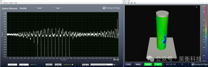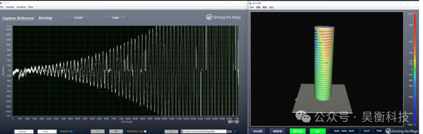 圓柱體上部施加壓力,同時(shí)對(duì)中部進(jìn)行降溫處理;軟件同步采集光纖解調(diào)儀的傳感數(shù)據(jù),實(shí)時(shí)生成三維云圖,清晰呈現(xiàn) “上部高應(yīng)變、中部低溫” 的場(chǎng)分布特征。