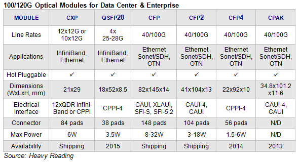 為數(shù)據(jù)中心和企業(yè)網(wǎng)絡(luò)提供更具成本效益的40G和100G解決方案的QSFP+/CXP光模塊和有源光纜廠商越來越多。目前,光模塊廠商都推出了第一款CFP2模塊,許多網(wǎng)絡(luò)設(shè)備制造商都采用了這種封裝模式,而少數(shù)在等待CFP4。思科則是逆主流而行,使用其專有的CPAK模塊。對于100G,長途設(shè)備制造商們正在使用in-house設(shè)計(jì)或OIF 168-pin模塊。
