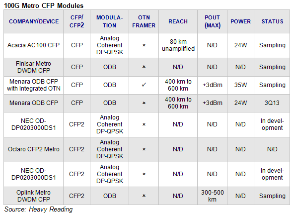 圖二展示了來自6家廠商推出的100G城域收發(fā)器產(chǎn)品。