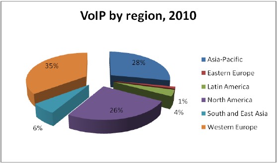 在這一年,全球每一個(gè)區(qū)域的VoIP用戶數(shù)都在增長(zhǎng)。越是成熟的VoIP市場(chǎng)增速相對(duì)較慢。例如,2010年西歐的用戶數(shù)增長(zhǎng)了8.68%,而東歐的用戶數(shù)增長(zhǎng)率近20%,雖然后者起點(diǎn)較低。
