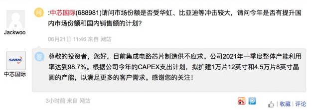 ICC訊 7月7日消息,中芯國際在互動平臺上回答投資者提問時表示,目前公司集成電路芯片制造供不應(yīng)求,一季度整體產(chǎn)能利用率達到98.7%。