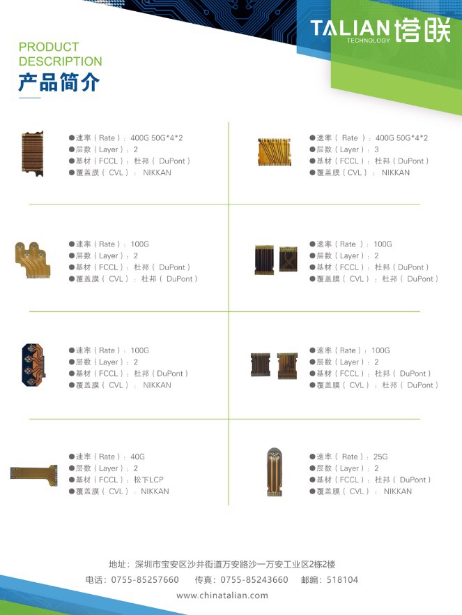 深圳市塔聯(lián)科技有限公司(www.chinatalian.com),是一家專業(yè)從事FPC的制造企業(yè),公司專注光模塊行業(yè)FPC生產(chǎn)制造,現(xiàn)公司擁有員工60多人,廠房面積2000多平米。 公司核心團(tuán)隊(duì)由多位超過10年的FPC行業(yè)專家級(jí)人士組成,在工藝技術(shù)、生產(chǎn)制造、品質(zhì)管控等方面具備成熟的體系和方法。塔聯(lián)科技目前主要產(chǎn)品包括:400G、200G、100G、40G、25G/10G/6G/2.5G光模塊FPC以及光模塊軟硬結(jié)合板。