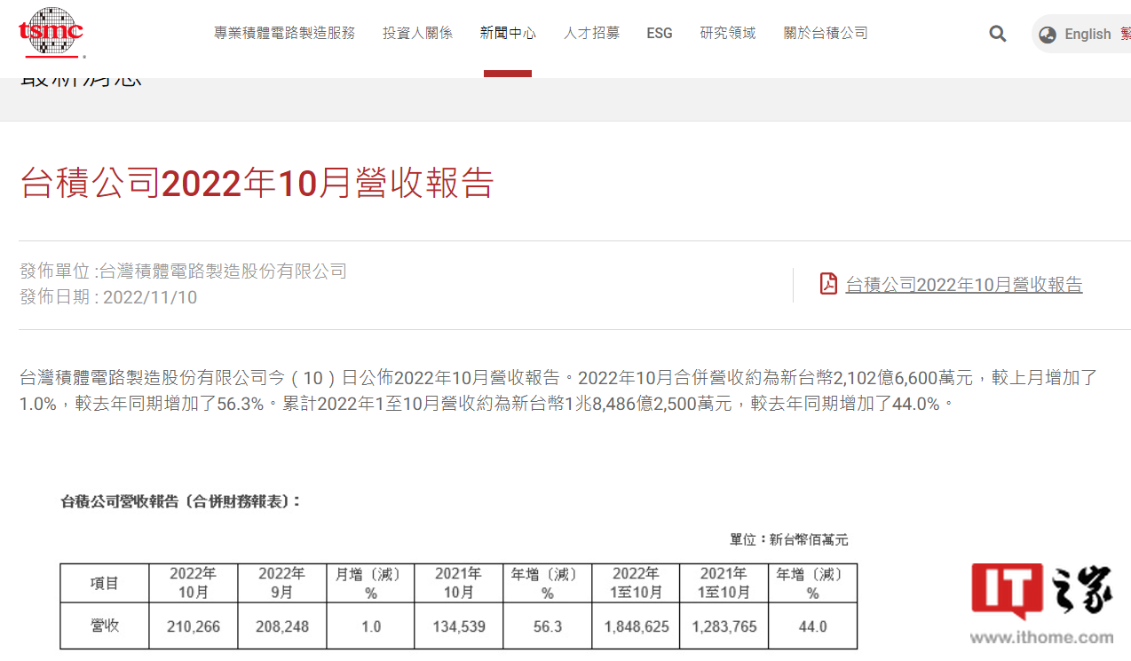 臺積電 2022 年 1 至 10 月累計營收約為 1.85 萬億元新臺幣(約 4218 億元人民幣),較去年同期增加了 44.0%。