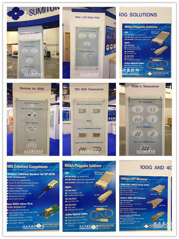 住友電工本次ECOC展出的新品有DWDM XFP 平臺(tái),傳輸速率可達(dá)11.3Gb/s,擁有43通道的100G 密集波分復(fù)用器,更低功率損耗。還有10G相關(guān)配套產(chǎn)品,1310nm DML XMD-MSA TOSA等。100G/40G相關(guān)的QSFP+相關(guān)模塊和產(chǎn)品為展出重點(diǎn),有40G-SR4和40G-LR4/ER4,以及正在開發(fā)的100G的CFP4產(chǎn)品和配套的TOSA和ROSA產(chǎn)品。同時(shí)還有推出100G相干收發(fā)器產(chǎn)品如相干接收器,1310nm SOA高功率可調(diào)激光器等。CFP/QSFP+ 產(chǎn)品為住友電工本次出展的重點(diǎn)也是本次展會(huì)的熱點(diǎn),推出產(chǎn)品涉及有100G 40G CFP TOSA/ROSA及模塊, 40G QSFP+ROSA及模塊,25Gb/s ROSA/TOSA。