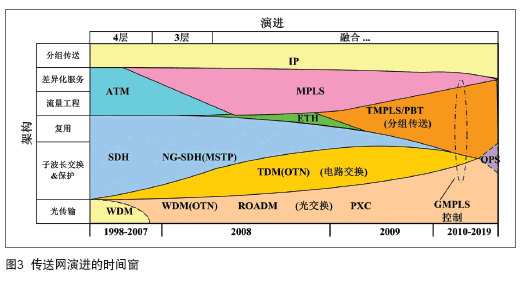我們注意到分組的“滲透”趨勢,涉及4個演進(jìn)階段:第一階段,電路交換結(jié)構(gòu)的傳輸設(shè)備及其表層的分組化特性;第二階段,波長交換結(jié)構(gòu)的傳輸設(shè)備及其表層的分組化特性;第三階段,電層的以分組交換為內(nèi)核的功能特性;第四階段,波長級的以分組交換為內(nèi)核的功能特性。第一階段和第二階段在某種程度上可同時并存(如NG-SDH、MSTP、MSPP),雖然發(fā)生有先后;在第四階段前,第三階段將長期占據(jù)主導(dǎo)地位。中興通訊認(rèn)為光傳輸行業(yè)將進(jìn)入第二階段和第三階段混合的時期,如圖2的架構(gòu)和圖3的時間窗所示。