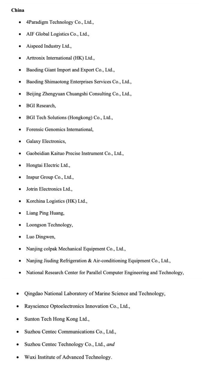 據(jù)悉,本次除了中國(guó)大陸地區(qū)的 28 家實(shí)體之外,還包含 1 個(gè)俄羅斯實(shí)體、1 個(gè)白俄羅斯實(shí)體、3 個(gè)緬甸實(shí)體、1 個(gè)中國(guó)臺(tái)灣的實(shí)體以及 4 個(gè)巴基斯坦實(shí)體。