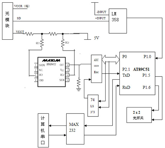c.通過(guò)計(jì)算機(jī)RS232串口,計(jì)算機(jī)與Atmel公司的AT89C51單片機(jī)通信,實(shí)現(xiàn)計(jì)算機(jī)采集光模塊發(fā)射端與接收端的工作電流、高低告警值的測(cè)量以及計(jì)算機(jī)向單片機(jī)發(fā)送命令控制光電開(kāi)關(guān)的切換。