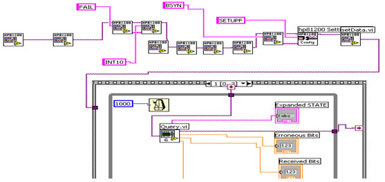 對(duì)誤碼儀的控制以美國(guó)國(guó)家儀器公司(National Instrument)的圖形化編程軟件LabVIEW7.0為基礎(chǔ),根據(jù)Agilent公司提供的函數(shù)面板文件,由LabVIEW中的轉(zhuǎn)換功能,將VISA庫(kù)轉(zhuǎn)換成LabVIEW下可以直接調(diào)用的小圖標(biāo)(每個(gè)小圖標(biāo)代表VISA庫(kù)中的一個(gè)基本函數(shù))。然后根據(jù)要實(shí)現(xiàn)的功能,把這些小圖標(biāo)用線連接起來(lái)。如圖3。