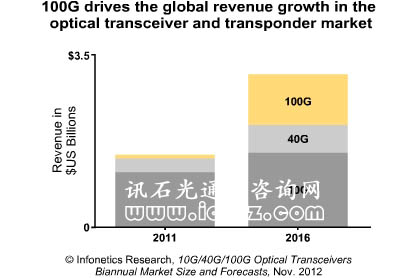 2012年的最終數(shù)據(jù),Infonetics預(yù)計整個光收發(fā)器市場同比將增7%,到2013年期間將呈現(xiàn)健康的兩位數(shù)增長,接近20億美元。