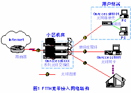 網(wǎng)絡(luò)主要由放置于小區(qū)機(jī)房的光線路終端(Optical Line Terminal—OLT )OnAccess5xxx系列低成本光口交換機(jī)和放置于用戶側(cè)的光網(wǎng)絡(luò)單元(Optical Network Unit—ONU)OnAccessH1001組成。傳輸媒介是單模光纖,可以選擇單纖,也可以選擇雙纖。一臺OnAccess5xxx 光交換機(jī)可以連接24 個用戶的OnAccessH1001光網(wǎng)絡(luò)單元,OnAccessH1001可以同時下聯(lián)多達(dá)4臺電腦或IP電話。如果用戶只有一臺電腦可以選擇OnAccess1001光纖網(wǎng)卡內(nèi)插于計算機(jī),直連接入光纖。接入帶寬為專線雙向100M,傳輸距離達(dá)20km。
