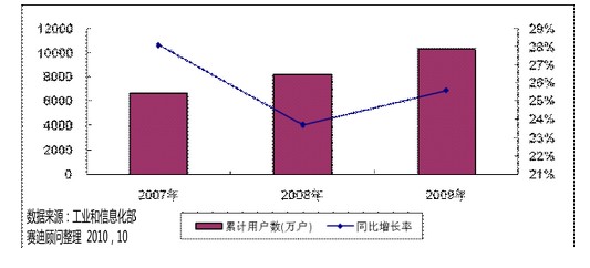 圖2 2007-2009年中國(guó)DSL用戶數(shù)量