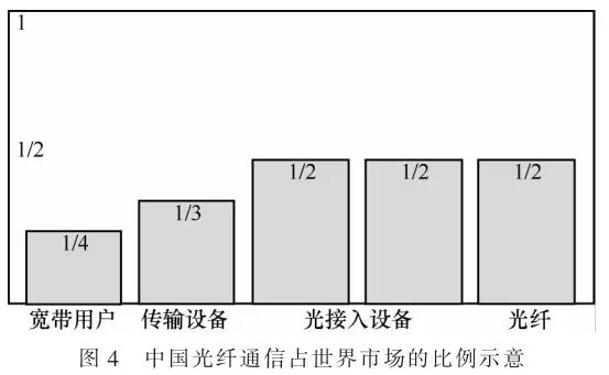 武漢院曾經(jīng)把光纖制造技術(shù)轉(zhuǎn)讓給江蘇的亨通線纜廠和其他廠商,帶動了中國的光纖光纜產(chǎn)業(yè)。現(xiàn)在,中國的光纖通信產(chǎn)量和市場占有率是世界第一,如圖4所示?! ?/p>