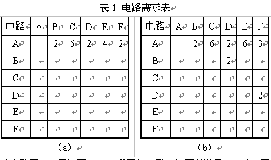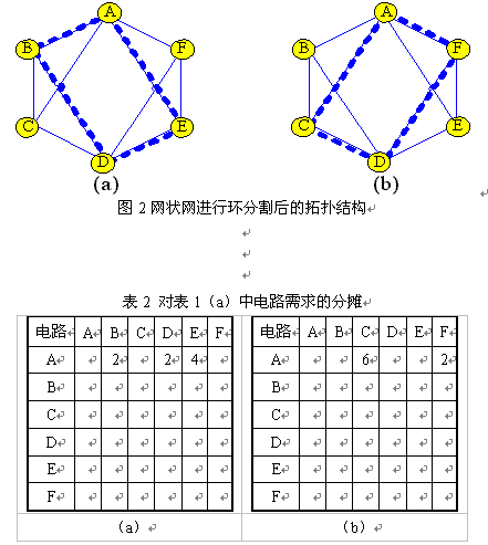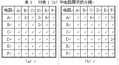 在電路需求有了一定增長,成為如表1(b)所示的電路需求之后,對于圖1(a)所示的環(huán)形網(wǎng)絡(luò),就必須新建一個環(huán),此時所需的鏈路數(shù)達到了2x6=12個。對于圖1(b)所示的網(wǎng)狀網(wǎng),類似的對表1(b)中的電路進行分割后,如表3所示,可以看出,分割后的兩個環(huán)上仍有足夠的容量承載新增的電路,網(wǎng)狀網(wǎng)所需鏈路數(shù)目仍為10個。此時,網(wǎng)狀網(wǎng)要比環(huán)形網(wǎng)資源利用率高。