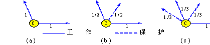 圖3保護業(yè)務(wù)進行負荷分擔(dān)的情況 在上面的例子中,我們是按照所有鏈路都留出50%的容量作為保護資源來考慮的。對于環(huán)形網(wǎng)絡(luò),網(wǎng)絡(luò)中每個節(jié)點的度為2,工作和保護業(yè)務(wù)分別從節(jié)點的兩個方向流通,鏈路上必須有一半的容量留做保護通道。而對于網(wǎng)狀網(wǎng),由于網(wǎng)絡(luò)中節(jié)點的度可能大于2,保護業(yè)務(wù)可以在除工作路徑外的其他不只一個保護路徑上進行負荷分擔(dān),如圖3所示。這樣,鏈路中的備用資源比例就可以進一步降低,能夠承載的電路數(shù)量就得到了增加,鏈路的資源利用率也得到了進一步的提高,網(wǎng)絡(luò)的成本可以進一步降低。