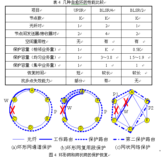 在環(huán)形網(wǎng)絡(luò)中,SDH自愈環(huán)提供兩纖單向通道倒換環(huán)UPSR、四纖雙向復(fù)用段倒換環(huán)BLSR/4以及兩纖雙向復(fù)用段倒換環(huán)BLSR/2等保護方法,使得網(wǎng)絡(luò)具有了快速的保護恢復(fù)能力,能夠?qū)崿F(xiàn)50ms的業(yè)務(wù)恢復(fù)時間要求,表4對這幾種自愈環(huán)的性能進行了比較。圖4給出了環(huán)形網(wǎng)絡(luò)中通道保護和復(fù)用段保護的基本原理。SDH網(wǎng)絡(luò)中的幾種自愈環(huán)技術(shù)也可以推廣到WDM環(huán)網(wǎng)中應(yīng)用,而且其特征基本上是一樣的。
