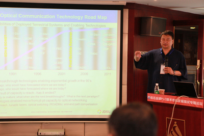 接下來,JDSU的PLC負(fù)責(zé)人華一敏博士與大家分享《全球PLC技術(shù)發(fā)展趨勢》。從PLC、PIC、波導(dǎo)技術(shù)、40G&100G解決方案,深入淺出、思路清晰,贏得了大部分參會(huì)者的認(rèn)同。下一個(gè)演講者也令大家十分期待,他就是光迅科技副總經(jīng)金正旺先生。他的演講題目也挑起了大家的濃厚興趣:《PLCS市場競爭與贏利模式》。他一上臺(tái)便先感謝大家對光迅上市的關(guān)注與祝福。之后,金總從FTTH市場、PLCS市場的商業(yè)模式、競爭模式、市場整合、競爭優(yōu)勢分析、市場趨勢等方面對PLCS市場競爭與贏利模式進(jìn)行了詳細(xì)而獨(dú)到的解說。