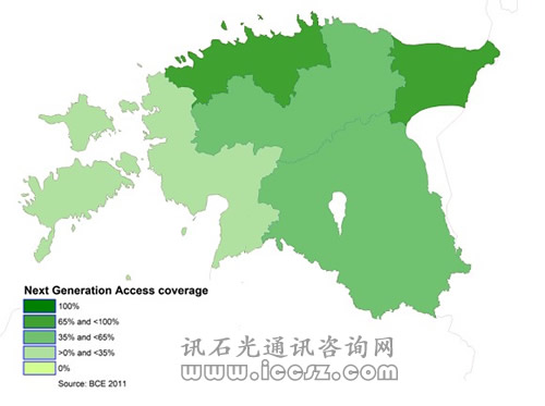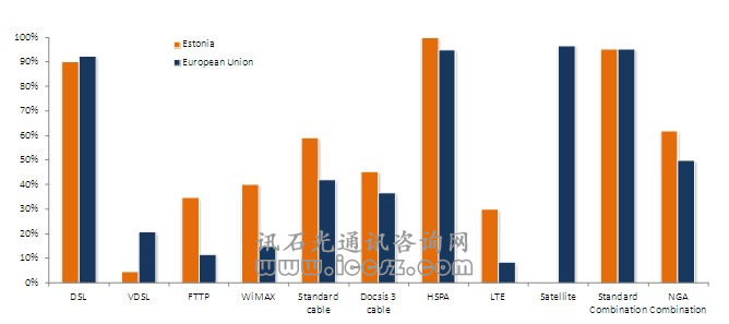 《2011歐洲寬帶覆蓋》調(diào)研報(bào)告顯示,愛沙尼亞95%的家庭能夠使用基本的寬帶,也就是說(shuō),只要他們想用,就可以獲得至少144kbps。大概62%能夠使用超高速寬帶(也成為NGA,即下一代接入)。在調(diào)研的29個(gè)國(guó)家中(歐盟27國(guó)和挪威、冰島),96%能夠獲得基本寬帶,超過(guò)50%(一半國(guó)家走向2020數(shù)字天堂目標(biāo))能夠獲得超高速。